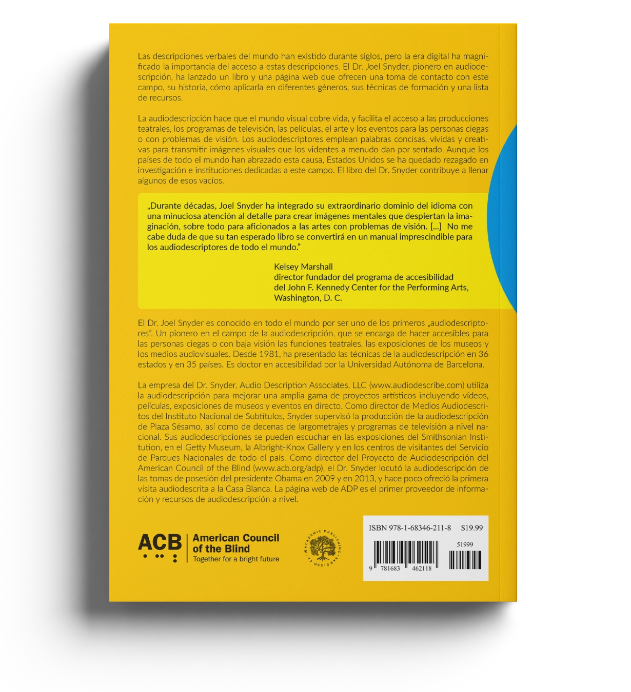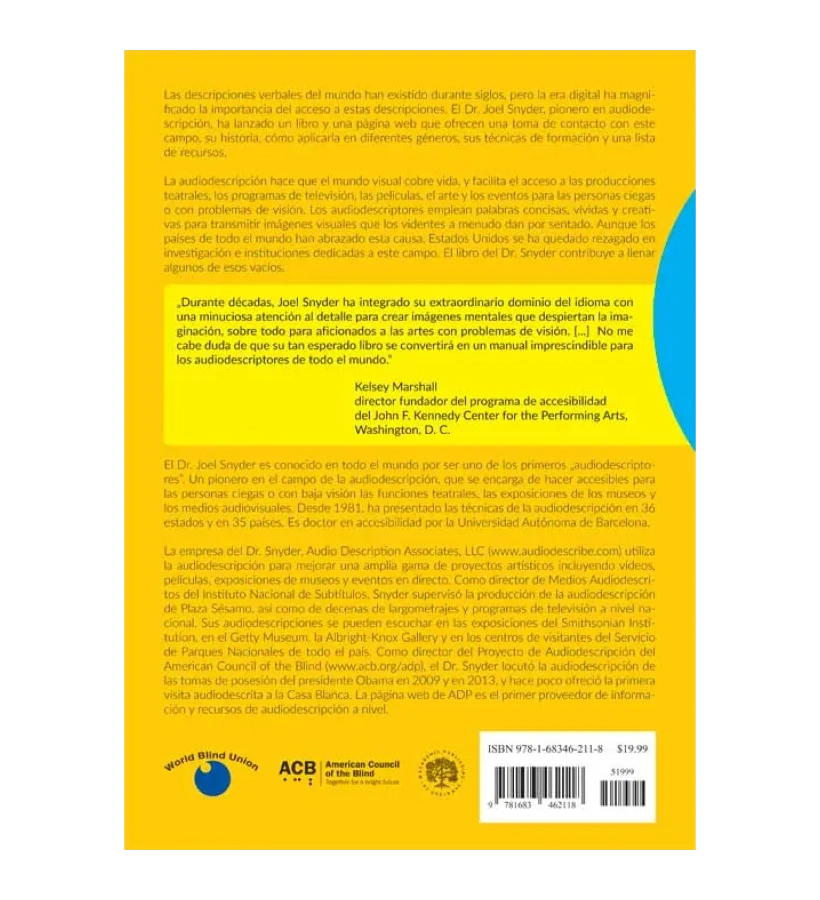 La audiodescripción hace que el mundo visual cobre vida, y facilita el acceso a las producciones teatrales, los programas de televisión, las películas, el arte y los eventos para las personas ciegas o con problemas de visión. Los audiodescriptores emplean palabras concisas, vívidas y creativas para transmitir imágenes visuales que los videntes a menudo dan por sentado. Aunque los países de todo el mundo han abrazado esta causa, Estados Unidos se ha quedado rezagado en investigación e instituciones dedicadas a este campo. El libro del Dr. Snyder contribuye a llenar algunos de esos vacíos.