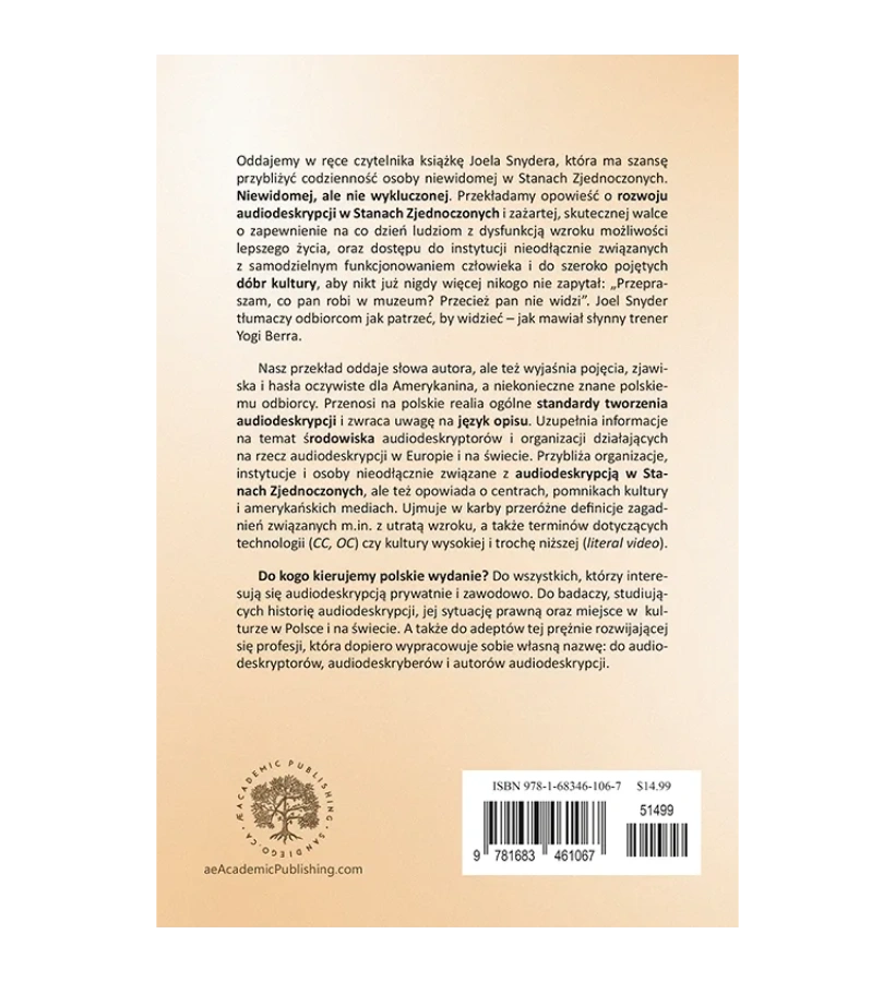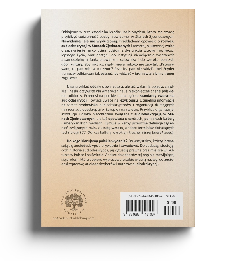Polskie wydanie pracy Joela Snydera kierujemy do badaczy studiujących historię audiodeskrypcji, jej sytuację prawną oraz miejsce w kulturze w Polsce i na świecie; ale też do adeptów tej prężnie rozwijającej się nowej profesji: do audiodeskryptorów, audiodeskryberów i autorów audiodeskrypcji.