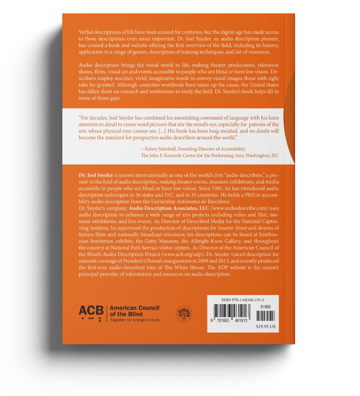 Audio description brings the visual world to life, making theater productions, television shows, films, visual art and events accessible to people who are blind or have low vision. Describers employ succinct, vivid, imaginative words to convey visual images those with sight take for granted. Although countries worldwide have taken up the cause, the United States has fallen short on research and institutions to study the field. Dr. Snyder’s book helps fill in some of those gaps, to include cultural attitudes toward the blind, a brief history of AD in the US and aborad, the fundamentals of the profession (what [not] to say and how), the role of AD in creading literacy, supplemented with exercises and images for practice in different context and advice on how to spread the practice of audio description in the communities.